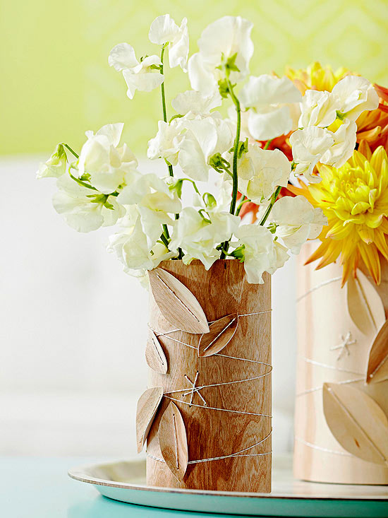 Wood grain radiates warmth and character in any space. Using veneer ? thin, flexible sheets of wood available at home centers and woodworking shops ? is an easy way to incorporate wood grains into your home. Cherry and maple veneer wrapped around apothecary jars and stitched with silver embroidery floss make a sweet centerpiece or mantel display. Cut leaf shapes from veneer and stitch onto jar wraps for a nature-inspired look.