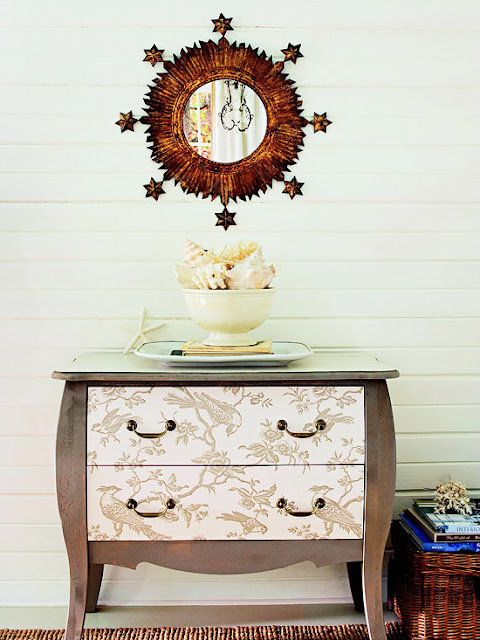 Transform a dresser with paint and wallpaper. Chic taupe paint and toile wallpaper highlight this dresser's traditional lines. Play with the position of the wallpaper until you're happy with the design, and then cut the paper to fit the drawer fronts. After painting the dresser, apply the wallpaper; protect it and the painted surfaces with an acrylic sealer .
