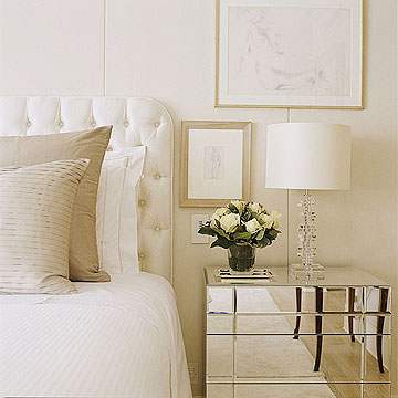 Tone-on-tone harlequin-pattern silk influenced this headboard's angular shape as well as the room's shimmery color scheme. Crisp linens and a Lucite lamp take their cues from the silver diamond shapes, while the fringed trim, custom-pleated shade, and sharkskin-wrapped side table connect with the fabric's ivory portions.
